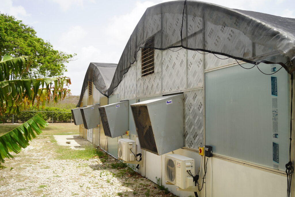 A combination of extractor fans, ventilation, and shading techniques help to keep the greenhouse cool enough to grow crops year round, and we continue to employ new techniques to improve our greenhouse environment.