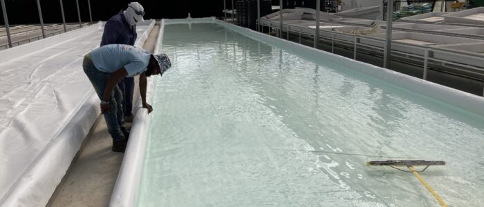 Seedlings are then placed into styrofoam raft boards that float atop the grow troughs allowing the plant roots to uptake nutrients from the oxygenated water flowing beneath.